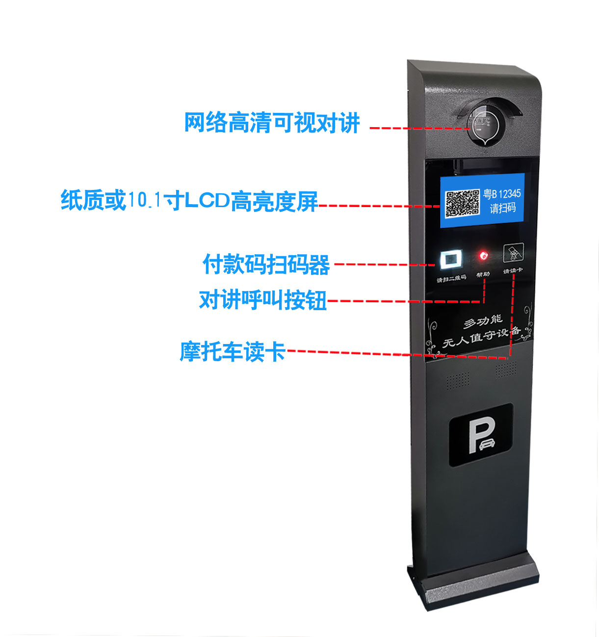 10.1寸高清的LCD顯示屏,可投放廣告圖片,顯示車輛信息、繳費二維碼及自定義顯示內(nèi)容;